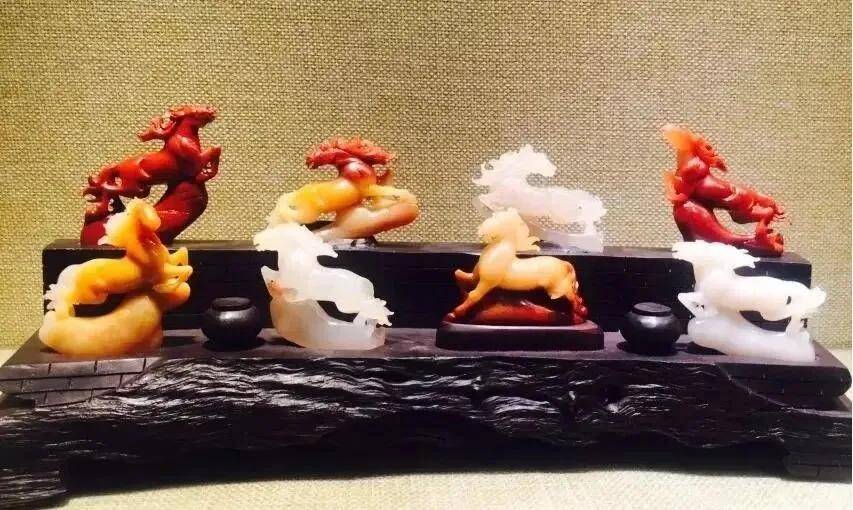 匠人以圆雕、透雕技法塑出八匹骏马,姿态各异:或扬蹄疾驰、或昂首嘶鸣,鬃毛飞扬如浪,肌肉线条劲健饱满,每一匹马都依石材天然形质雕琢,既保留了不同品种石的温润质感,又将奔腾的动感与张力具象化。作品错落排布于风化黑檀木底座之上,天然木座的苍劲纹理与寿山石的明艳色彩形成鲜明对比,让整体造型层次丰富、气势连贯。