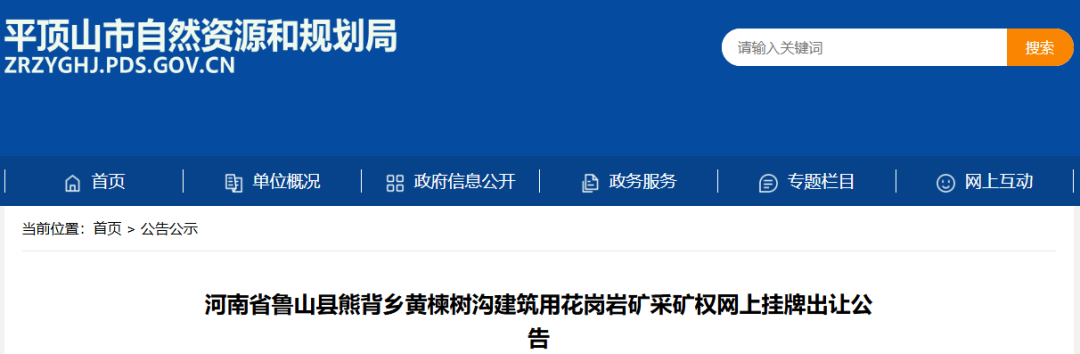 近日,河南平顶山市自然资源和规划局发布河南省鲁山县熊背乡黄楝树沟建筑用花岗岩矿采矿权网上挂牌出让公告。根据公告内容,该项目位于平顶山市鲁山县熊背乡黄楝树沟,可采储量为2705.2×104t,建筑用砂1466.2×104t,同体共生钾长石(斑晶)599.2×104t。开采方式:露天开采;生产规模:200万吨/年。矿山生产服务年限为14.2年,基建期0.5年,起始价5023.95万元。